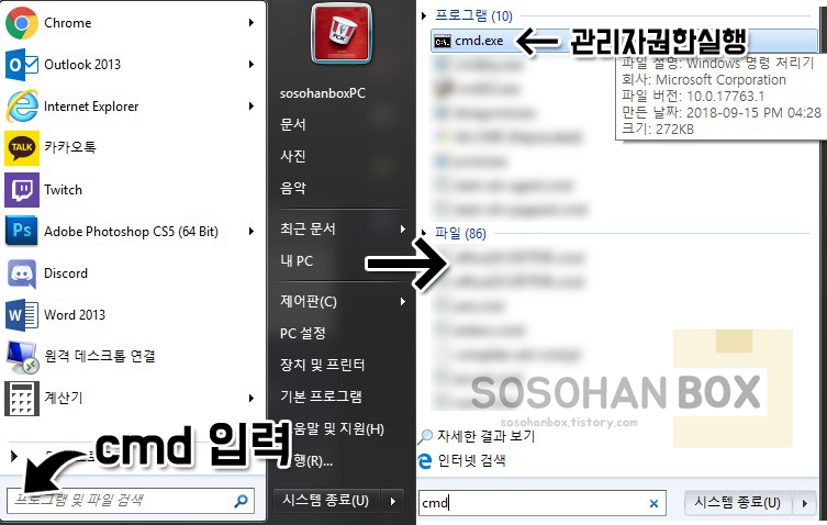 1. 시작 단추를 누르고 cmd를 검색해서 관리자 권한으로 실행해주세요.(오른쪽 마우스 클릭으로 이용)