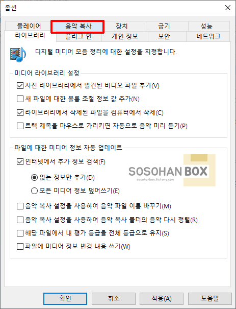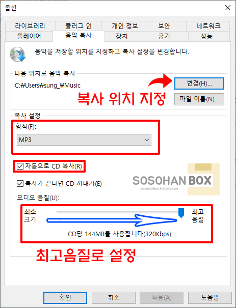 4. 저장하고 싶은 경로 설정하고 형식은 MP3가 맞는지 확인 CD 넣을 때 마다 자동으로 복사(변환)하고 싶다면 자동으로 CD 복사(R) 체크 아니면 놔두면 됩니다.