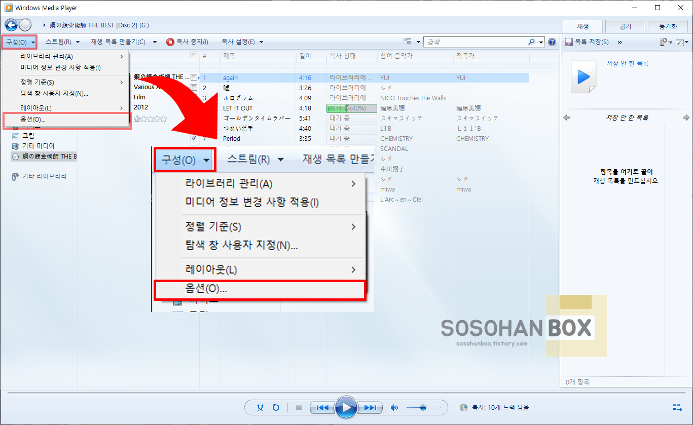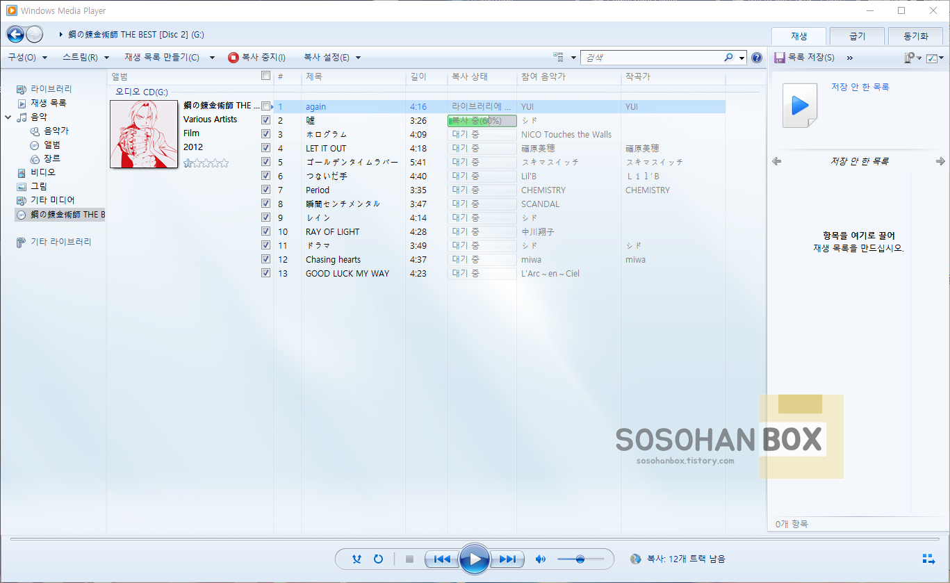 5. 전체 선택 및 변환하고 싶은 곡 부분 선택 후 CD 복사(I) 클릭