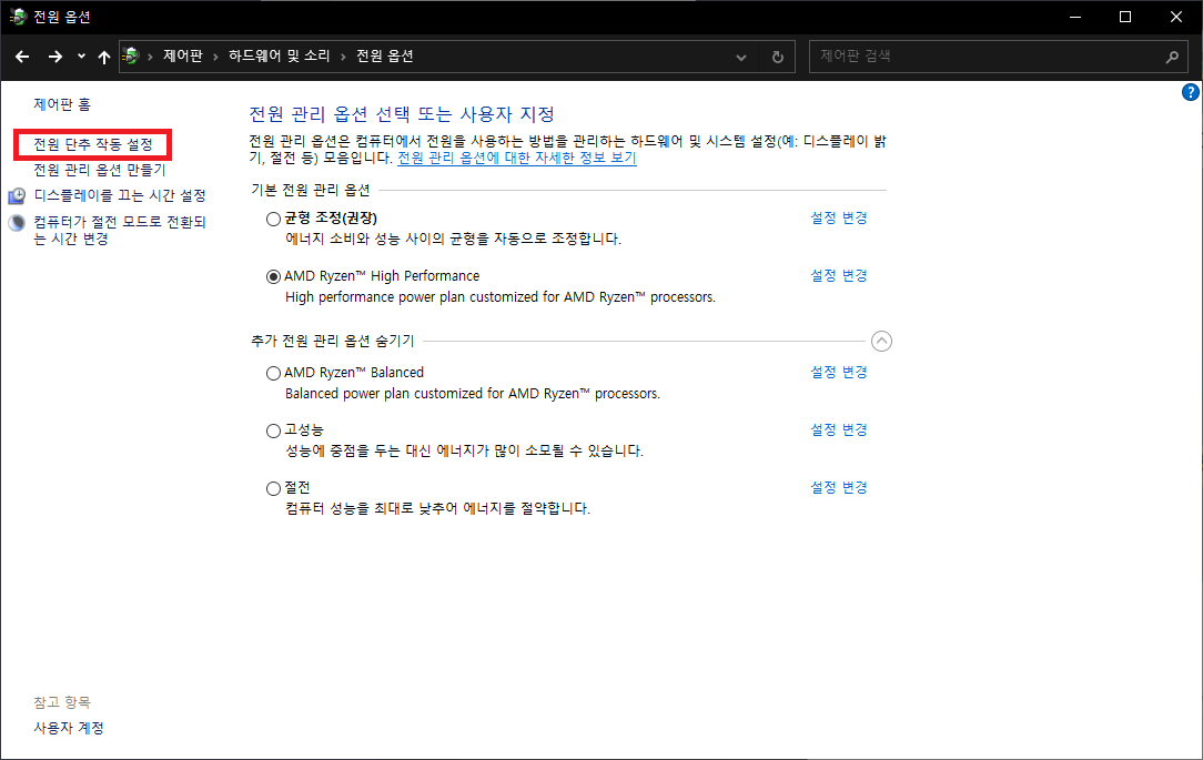 전원 옵션 창에서 왼쪽 메뉴에 있는 목록 중 전원 단추 작동 설정을 눌러주세요.