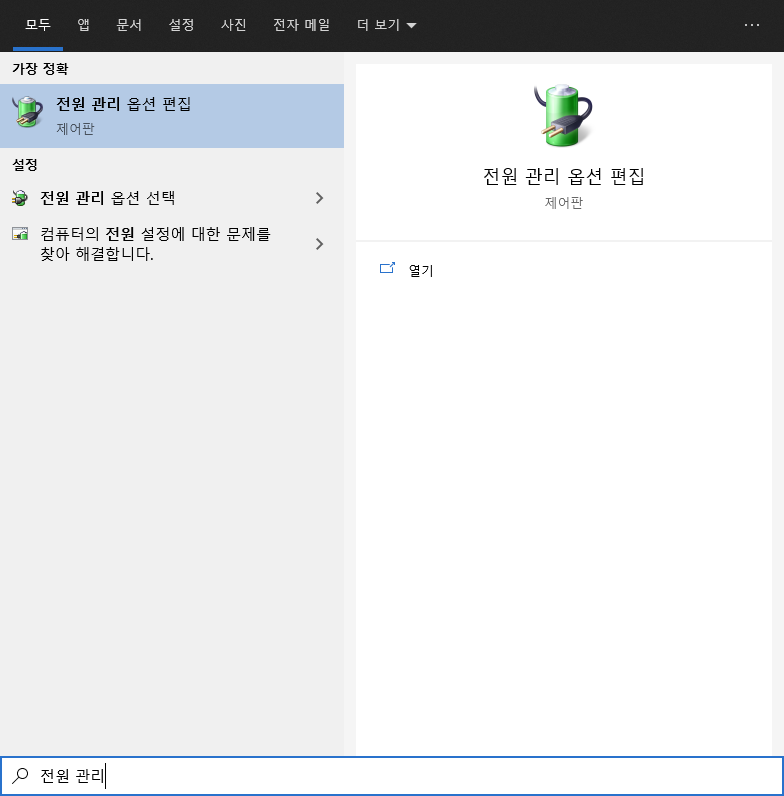 윈도우 키를 누르시고 전원 관리 까지 입력하시면 하기 이미지 처럼 결과 창이 뜨실겁니다.