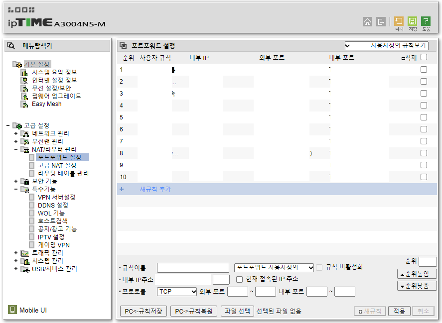 이제 포트포워딩 설정입니다.고급 설정 → NAT/라우터 관리 → 포트포워드 설정