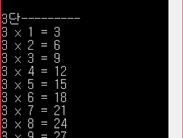 1 2 3 4 5 6 7 8 9 10 11 12 13 14 15 16 17 | #include <iostream> using namespace std; int main(){ // 2~9단까지 반복 for(int i = 2; i <= 9; ++i){ // i단 표식 cout << i << "단 ------------\n"; // 1~9까지 반복 for(int j = 1; j <= 9; ++j){ cout << i << " x " << j << " = " << i * j << endl; } } return 0; } | cs |